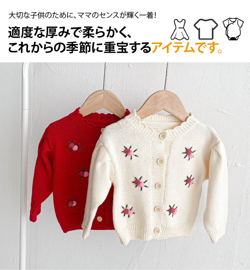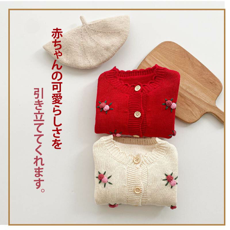 カーディガン 女の子 2色 アウター 綿100% 毛糸 ベビー服 ベビートップス クルーネック 春 秋 冬 無地 フラワー 刺繍 綿 日常/カジュアル ニット ニットウェア メリヤス ベージュ レッド 女児 赤ちゃん 保育園 幼稚園 贈り物 66cm 73cm 80cm
